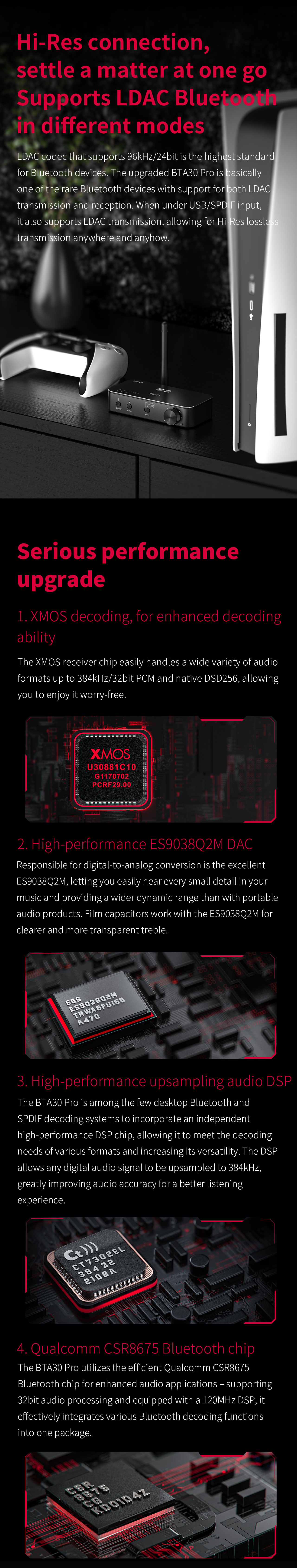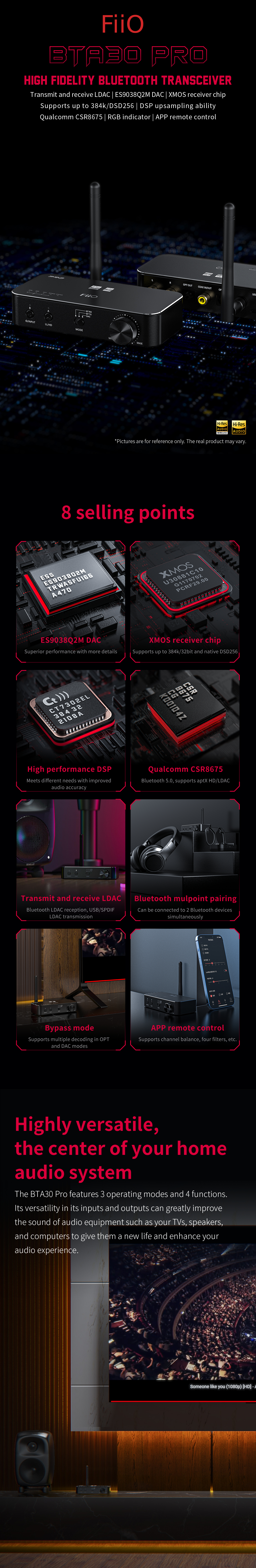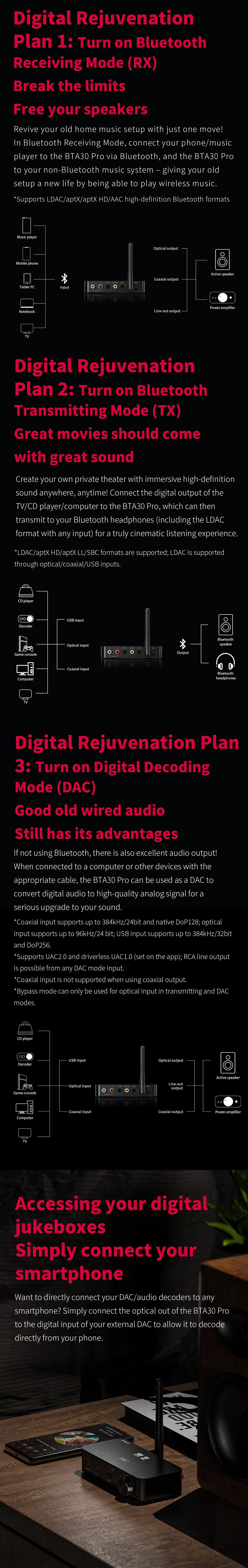 The FiiO BTA30PRO Hi-Fi Bluetooth Transceiver (Transmitter and Receiver), is a Bluetooth decoder with three modes of Bluetooth reception, Bluetooth transmission and digital decoding. It is equipped with a Qualcomm CSR8675 Bluetooth chip, an independent high-performance DSP chip and a high-performance AK4490 DAC. The FiiO BTA30PRO supports high-specification sampling rate and DSD hard solution. The FiiO BTA30PRO features 3 operating modes and 4 functions. Its versatility in its inputs and outputs can greatly improve the sound of audio equipment such as your TVs, speakers, and computers to give them a new life and enhance your audio experience.