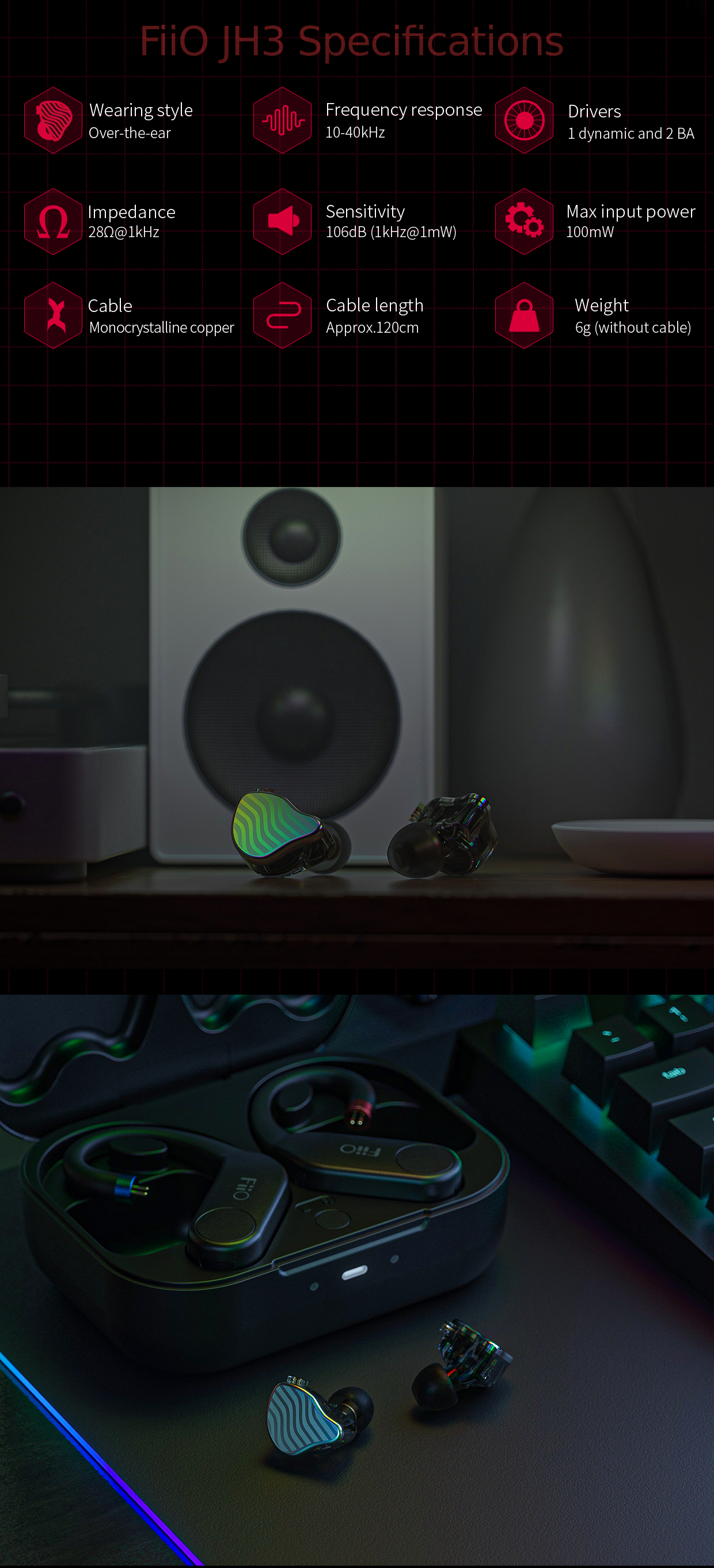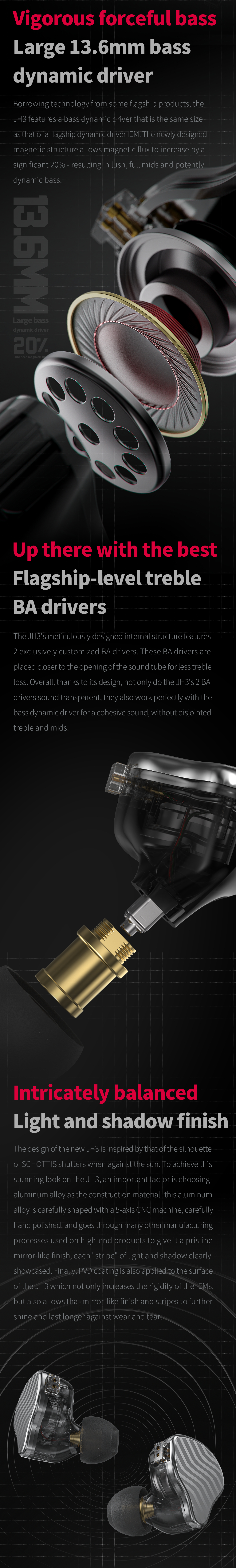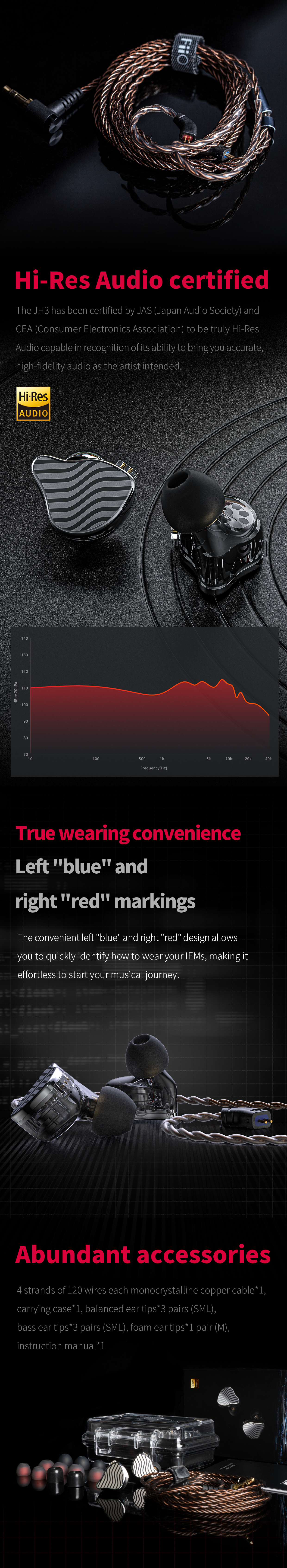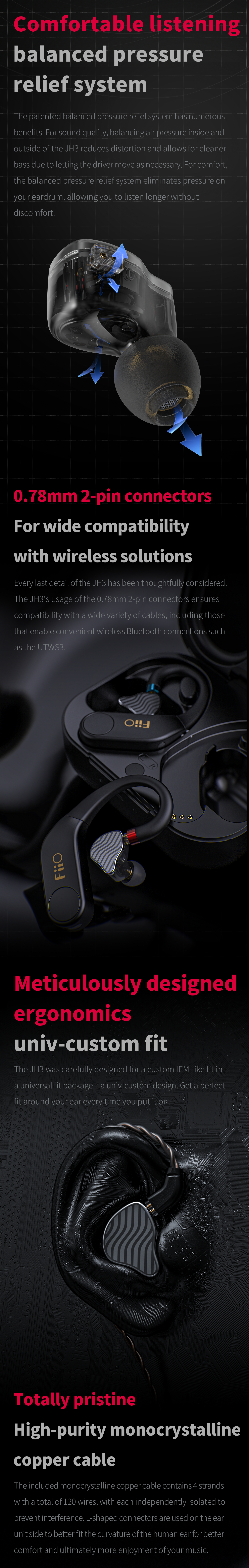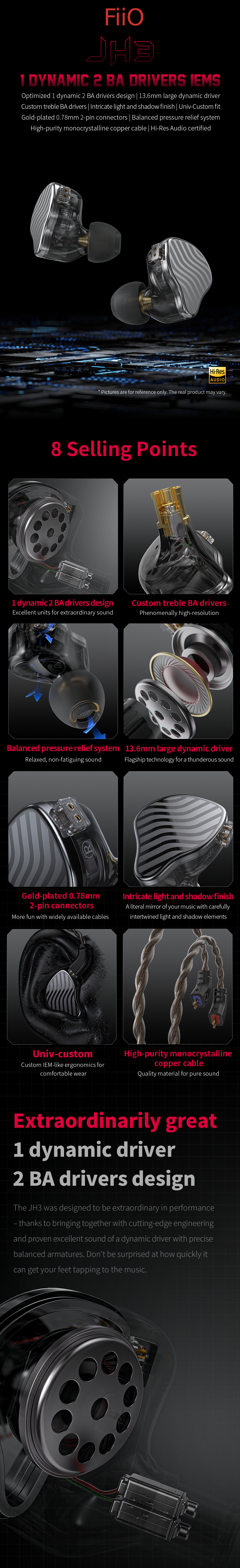 The FiiO JH3 Triple Driver Hybrid IEM features an optimized single large 13.6mm dynamic driver along with dual custom balanced armature drivers to achieve extraordinary performance. Gold-plated 0.78mm 2-pin connectors, a balanced pressure relief system and a high-purity monocrystalline copper cable also feature in this flexible and high performance IEM.