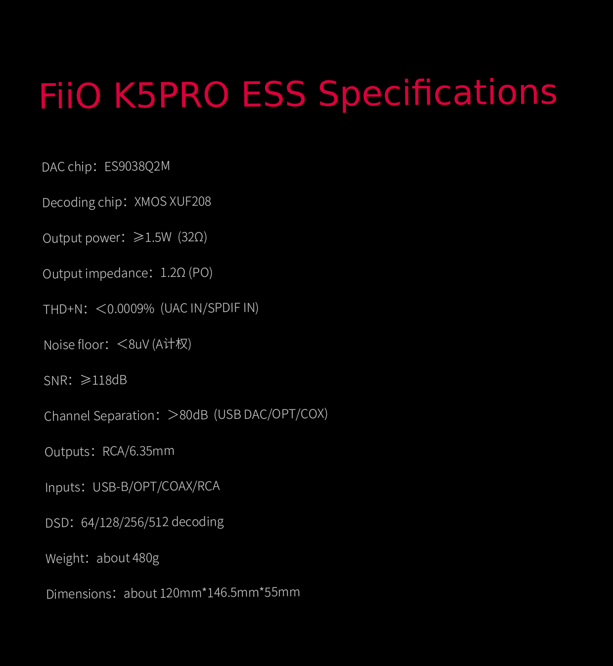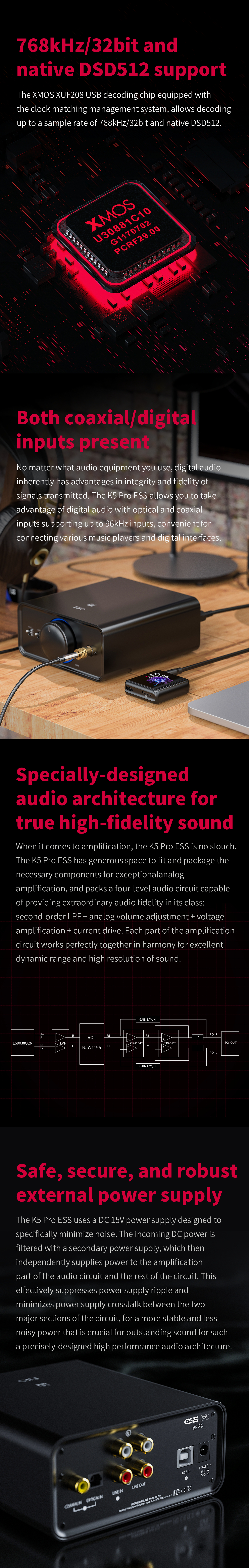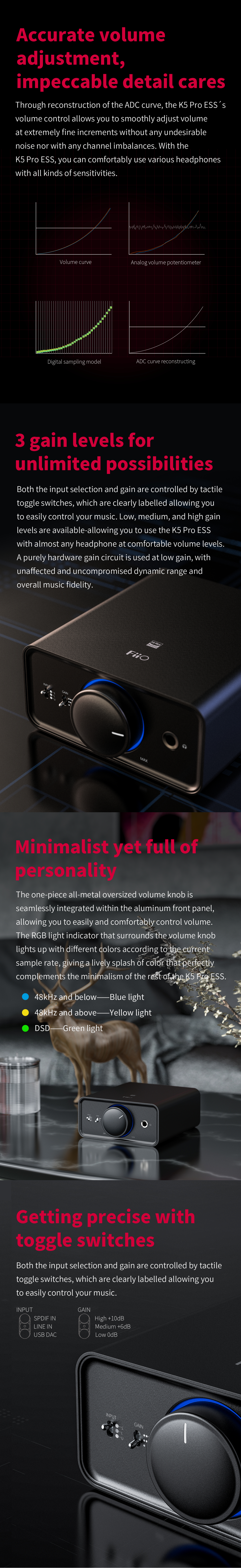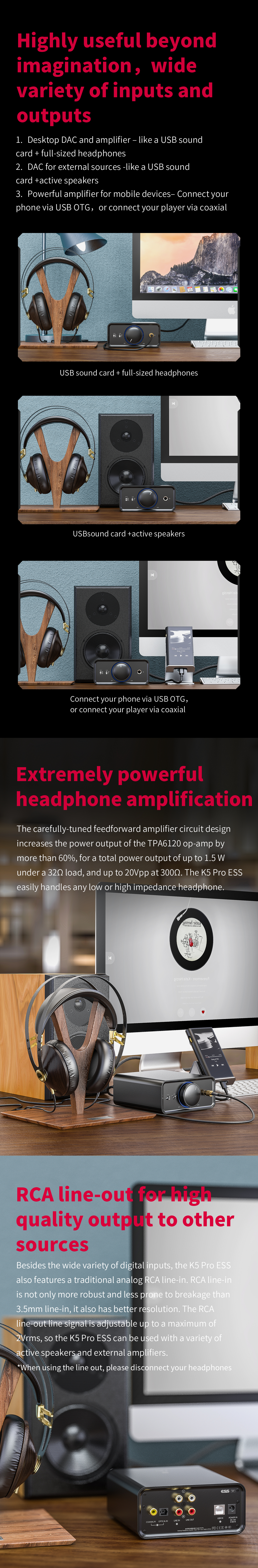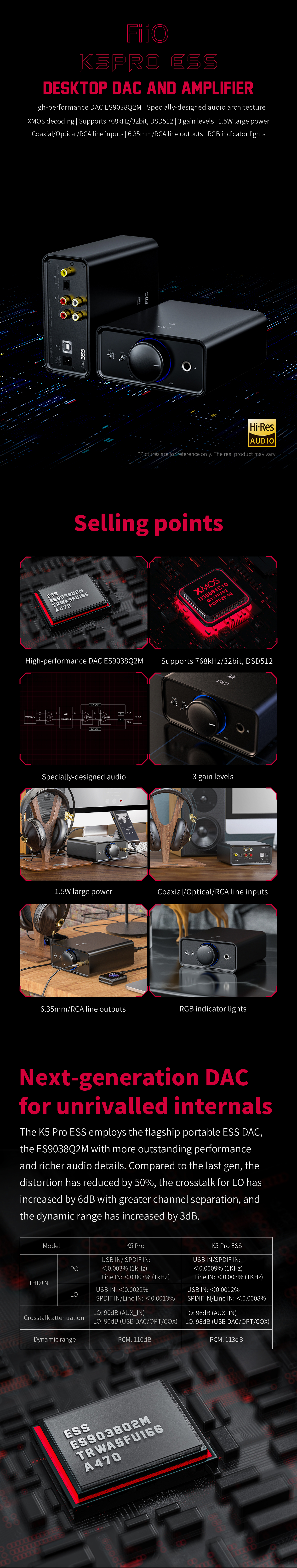 The FiiO K5PRO ESS Edition Desktop DAC and Amplifier uses the ESS ES9038Q2M DAC which has outstanding performance and helps produce rich audio details. The FiiO K5PRO ESS also features three gain levels, 1.5W of power and multiple inputs and outputs making it a very versatile device.