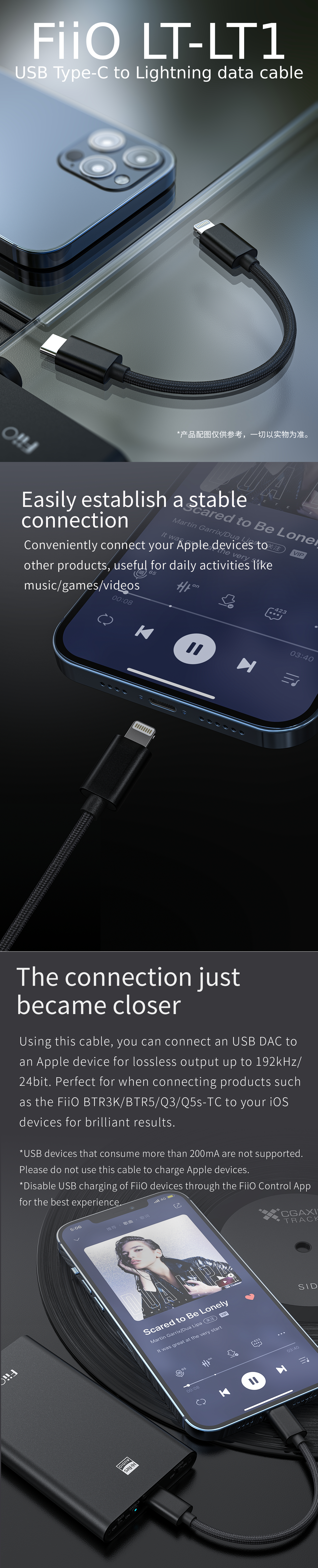 Conveniently connect your Apple devices to other products via the FiiO LT-LT1 Cable which supports music playback, so your music favourites always come with you.