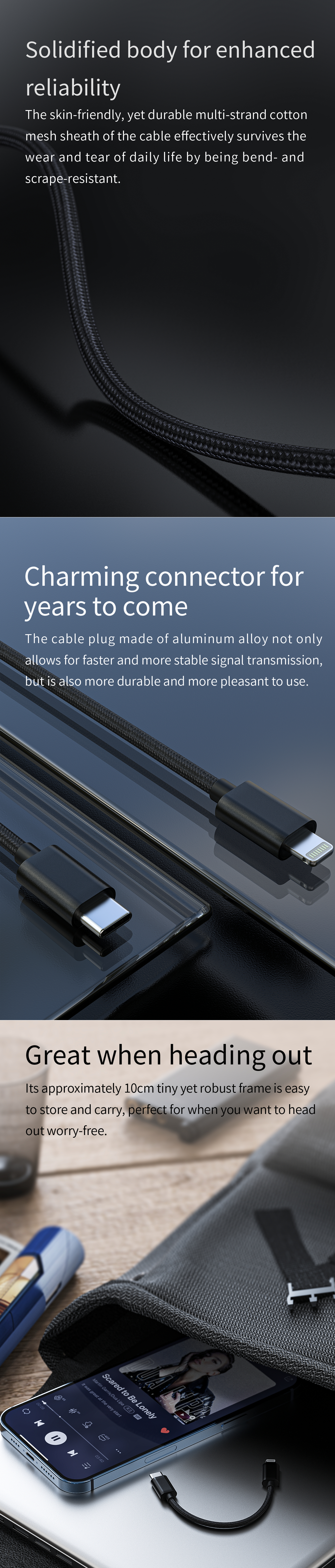 The skin-friendly and durable multi-strand cotton mesh sheath of the cable effectively survives the wear and tear of daily life by being bend and scrape resistant.